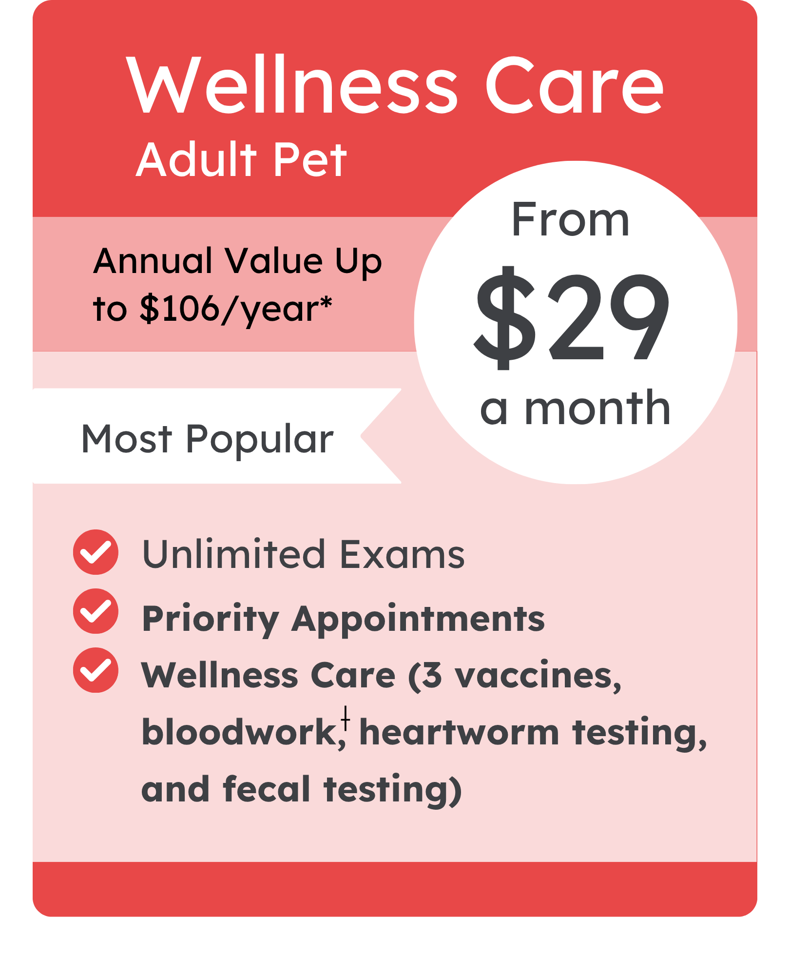 No surprises. No jargon. Just straightforward pricing, unlimited exams, priority care, and all the savings and support you and your pet need.